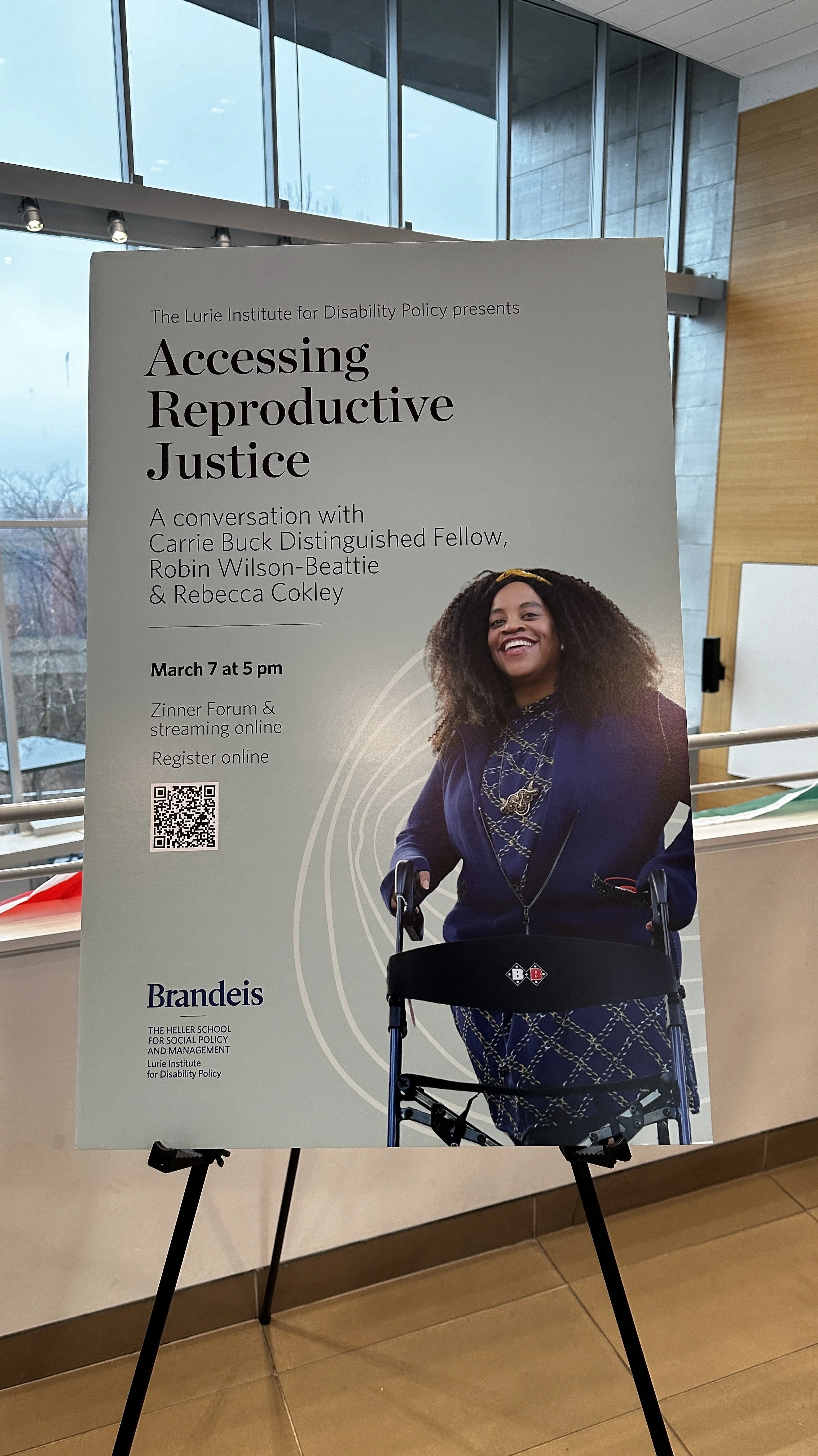 Poster featuring a full-length photo of a smiling Robin WIlson-Beattie, holding the handles of her walker. The text on the poster reads : The Lurie Institute for Disability Policy presents Accessing Reproductive Justice, A conversation with Carrie BUck Distinguished Fellow and Rebecca Cokeley. March 7 at 5pm